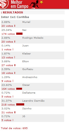 Leandro Damião foi eleito o melhor jogador em campo contra o Coritiba pela torcida do Internacional. Ele recebeu 218 votos dos 695 computados aqui no site oficial. Confira: