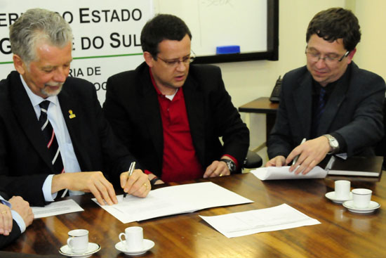 José Fortunati (E), Beto Albuquerque e Sérgio Dias assinam termo