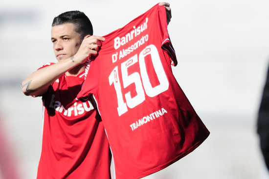 Certamente um dos grandes ídolos da história mais que centenária do Internacional, o meia argentino D'Alessandro chegou a uma marca importante pelo Clube do Povo: completou 150 jogos com a camisa colorada no jogo contra o Figueirense no meio da semana. Antes da partida contra o Atlético-MG neste domingo, a diretoria do Inter homenageou o atleta com uma camisa comemorativa, trazendo o número 150 às costas. O diretor executivo de futebol, Fernandão, fez a entrega.