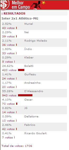 Foram 934 votos para D'Alessandro na enquete do site oficial do Inter. O jogador foi eleito o melhor em campo na vitória do Colorado sobre o Galo Mineiro neste domingo, no Beira-Rio. Veja os resultados: