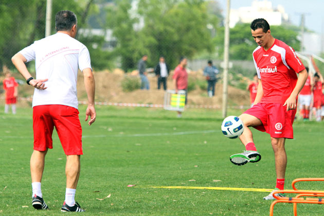 O artilheiro do Inter na temporada iniciou nesta quarta-feira uma nova etapa no processo de recuperação da lesão muscular sofrida na partida contra o Figueirense, no dia 21 de setembro. Supervisionado pelo coordenador de preparação física Élio Carravetta, o jogador correu em volta do gramado pela manhã e bateu bola com o técnico Dorival Júnior. A tarde foi de descanso, e será assim até sábado, com o atleta se exercitando somente no turno da manhã.