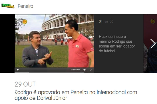 Após visita ao Beira-Rio no início de outubro para gravar com o centroavante Leandro Damão, no Beira-Rio, o apresentador da Rede Globo Luciano Huck exibiu neste final de semana o quadro 'Peneira'. A atração dá oportunidade a um garoto de realizar testes no Clube para tentar conseguir uma vaga nas categorias de base. Huck levou o jovem Rodrigo Aquino Teixeira para treinar na base do Internacional e receber dicas de Damião. A receita deu certo e o garoto foi aprovado, com aval do técnico Dorival Júnior e do diretor técnico Fernandão. Confira o belo vídeo clicando aqui!