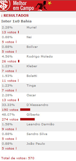 O atacante Gilberto, autor do gol da vitória sobre o Bahia, foi eleito o melhor jogador em campo na partida disputada nesta quarta-feira, no Beira-Rio. O camisa 11 do Inter recebeu 274 votos (48.07%) na enquete promovida pelo site do Clube. O meia D'Alessandro foi o segundo mais votado. Confira os números abaixo: