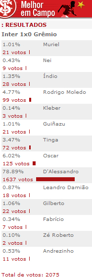 Ele foi o protagonista do Gre-Nal 389. D'Alessandro marcou o gol da vitória e foi determinante na conquista da vaga na Pré-Libertadores. A torcida colorada reconheceu a grande atuação do argentino o elegendo como o melhor jogador do clássico, em enquete realizada pelo site. Foram 1637 votos, o que representa 78.89%. Confira os números da votação:
