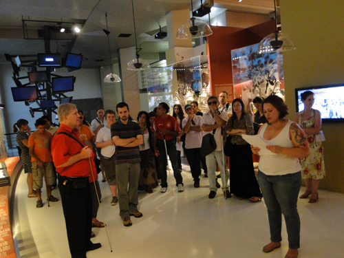 Nesse último dia de atividades, os alunos do curso proporcionaram uma experiência diferenciada para os visitantes do Museu. A visita foi realizada por intermédio da audiodescrição do ambiente. Os funcionários do Museu distribuíram vendas para que as pessoas que não têm deficiência visual pudessem acompanhar a visita orientada somente pela voz do guia.