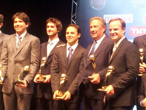 Matheus Stumpf (2° da esq. pra dir.) exibe seu troféu junto de nomes da atualidade do automobilismo nacional como Felipe Massa e Rubens Barrichello