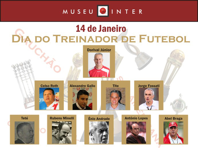 Por nos tornar um clube “Campeão de Tudo” o Museu do Inter saúda a todos os treinadores de futebol, em especial aos colorados, desde aqueles que trabalharam nas nossas escolinhas do Genoma Colorado e Escola Rubra até os profissionais das categorias de base e do grupo principal.