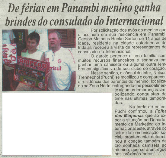 Gerson Matheus Henke Sartori, 11 anos, mora em Indaial – SC e é torcedor do Colorado. O garoto pertence a uma família sem muitos recursos financeiros e sonhava em ganhar uma camisa oficial. O cônsul do Inter, Nelsor Trennephol, se mobilizou para conseguir alguns brindes para o menino. Com o departamento de Marketing e Comunicação Social do Sport Club Internacional, Trennephol conseguiu realizar o sonho do pequeno Gerson. Ele receberá o manto sagrado do Internacional. Confira a matéria que saiu no jornal local.