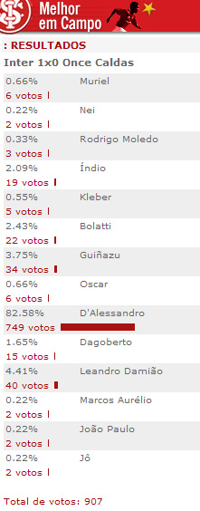 O meia argentino D'Alessandro foi eleito o melhor jogador em campo na partida desta quarta-feira (25/01), contra o Once Caldas, pela Libertadores. O jogador, que deu o passe para o gol de Leandro Damião na vitória colorada por 1 a 0, recebeu 82,58% dos 907 votos. Veja o resultado: