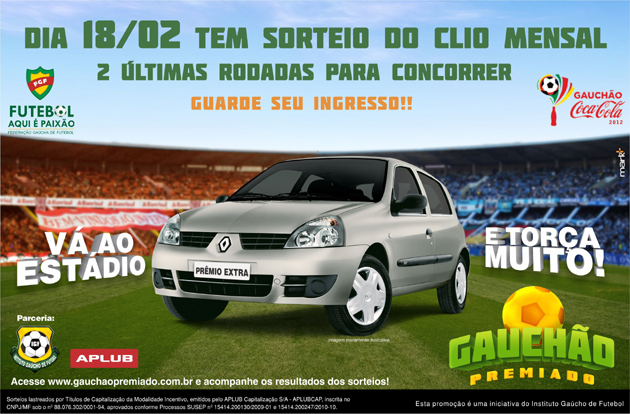 No dia 18/02 será realizado o sorteio do primeiro Clio Mensal da promoção Gauchão Premiado. Você, colorado, ainda tem duas chances para concorrer ao prêmio neste mês. Vá torcer pelo Inter no domingo (12/02) contra o Caxias, no Centenário, e na quarta-feira (15/02) contra o Cruzeiro, no Beira-Rio, guarde o ingresso e espere o sorteio.