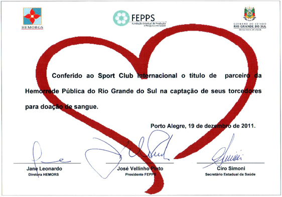 Durante o período de veraneio, as doações de sangue caem até 20%. Mesmo com os estoques satisfatórios, o Hemocentro tem o objetivo de manter os níveis de segurança. O Inter, que no final de 2011 recebeu o certificado de parceiro da instituição, pede que seus torcedores, que são tão fiéis no apoio ao time, também mostrem o seu poder de cidadania.