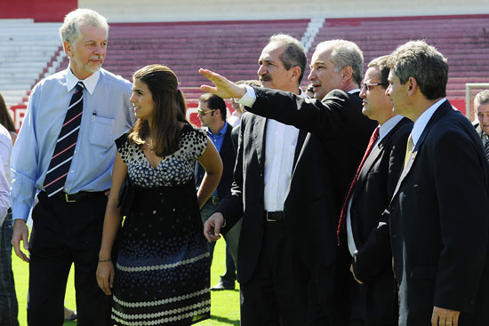 O ministro do Esporte, Aldo Rebelo, visitou as obras do Estádio Beira-Rio, na manhã desta terça-feira (14/02). A comitiva foi recepcionada pelo presidente do Internacional, Giovanni Luigi, e demais dirigentes do Inter na sala da presidência, seguindo para o campo do Beira-Rio, onde foi possível ver de perto os preparativos para a Copa do Mundo de 2014.
