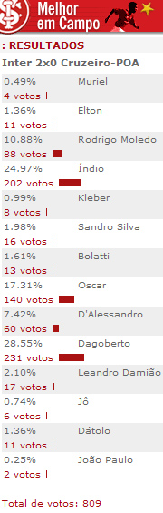 A boa atuação de Dagoberto fez com que ele fosse eleito pela primeira vez como o melhor jogador em campo, em enquete promovida pelo site do Clube. Foi uma disputa parelha com Índio, que também vive boa fase no time colorado. Confira os números da votação: