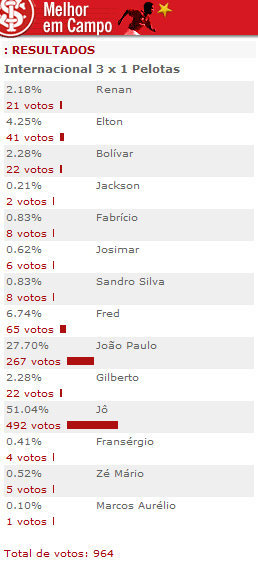 O atacante Jô foi eleito o melhor jogador em campo na partida diante do Pelotas, no sábado de Carnaval. Autor de dois dos três gols colorados na vitória por 3 a 1, Jô recebeu 51,04% dos votos na enquete realizada pelo site do Inter. Confira abaixo o resultado completo da votação: