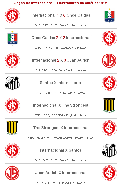 Ainda em março, o Inter terá mais dois jogos pela maior competição da América. Será contra o The Strongest, da Bolívia, dia 13, no Beira-Rio, e em La Paz, no dia 21.