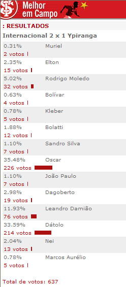 O meia Oscar foi eleito o melhor jogador em campo na partida diante do Ypiranga, no último sábado (04/03). Autor de um gol de falta na vitória por 2 a 1, Oscar recebeu 35,48% dos votos na enquete realizada pelo site do Inter. Confira abaixo o resultado completo da votação: