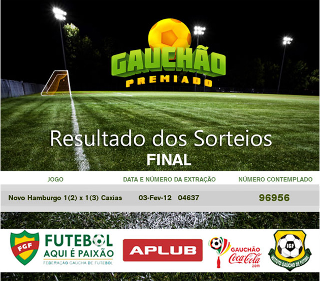 O Gauchão Premiado continua sorteando torcedores que vão aos jogos do estadual com TV's de 42 polegadas e automóveis Clio 0km. Todos os torcedores que adquirem ingressos para as partidas do campeonato estão concorrendo. Os bilhetes são cumulativos: quanto mais o participante adquirir, mais chances terá de ser contemplado. Então, não esqueça de guardar as suas entradas para ter mais chance de ser um dos vencedores. Saiba mais clicando aqui!