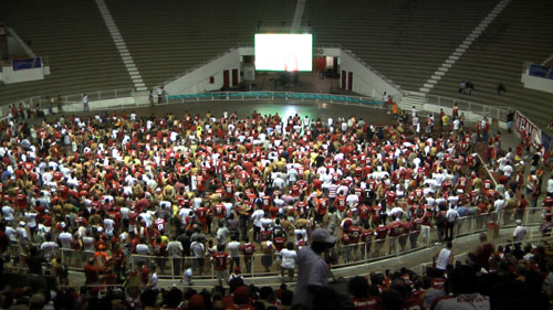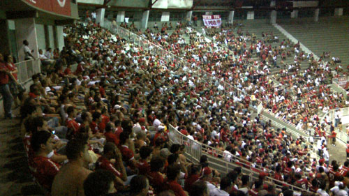 Cerca de 5 mil torcedores colorados vieram ao ginásio Gigantinho ver o jogo Santos x Inter na noite desta quarta-feira (07/03) em telão instalado em razão de parceria do Clube com a Oi TV e a Fox Sports. Apenas sócios puderam usufruir do privilégio ao trazer dois quilos de alimentos não-perecíveis.