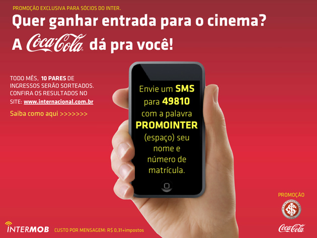Vem aí mais uma grande promoção exclusiva para os sócios colorados com suas mensalidades em dia. É uma parceria da Coca-Cola com o Internacional para sortear ingressos para o cinema exclusivamente para os sócios. Basta enviar um SMS com a palavra PROMOINTER para 49810 + nome e número de matrícula (custo por mensagem é de R$ 0,31+impostos). Os resultados serão divulgados toda a quinta-feira no site do Inter e os ingressos devem ser retirados na Central de Atendimento ao Sócio (CAS).
