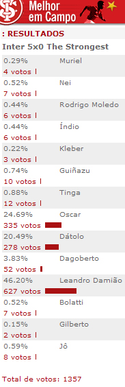 O atacante Leandro Damião, autor de três gols na vitória de 5 a 0 sobre o The Strongest, foi eleito o melhor jogador em campo em enquete realizada pelo site oficial. O camisa 9 chegou ao 10º gol na Libertadores e se tornou o maior artilheiro colorado na história da competição continental. Veja os números da votação: