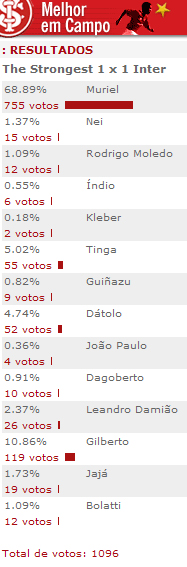 O goleiro Muriel fez grandes defesas no empate com o The Strongest e recebeu o reconhecimento do torcedor colorado, que o elegeu o melhor em campo em enquete promovida pelo site. Veja os números da votação: