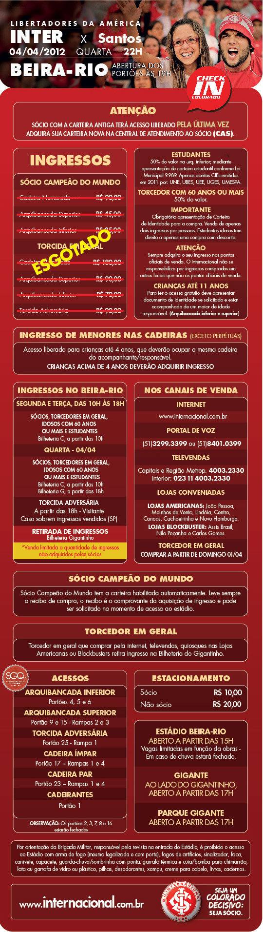 O Internacional informa que todos os 8 mil ingressos colocados à venda para Inter x Santos, pela Libertadores, estão esgotados. A partir da tarde deste sábado (31/3) até as 23h55 de segunda-feira (02/04), os sócios da modalidade Campeão do Mundo poderão acessar a área exclusiva do site do Inter (www.internacional.com.br/socios) para se cadastrar na Lista de Espera.