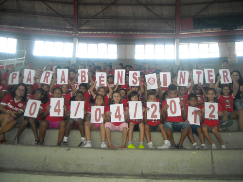 O projeto social Interagir comemorou na tarde desta quarta-feira, 4 de abril, o aniversário do Internacional. Aproximadamente 100 crianças e adolescentes atendidos pelo projeto cantaram parabéns ao Inter e prestaram singela homenagem nas arquibancadas do ginásio Gigantinho.