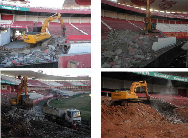 A reforma do Gigante da Beira-Rio que reiniciou em 20 de março já está completando sua quarta semana de trabalho e avança em grande velocidade. Atualmente o Gigante passa pelo processo de demolição das arquibancadas inferiores (antiga sociais), escavação do solo, colocação das novas estruturas de concreto da arquibancada (nas antigas sociais também) e retirada das cadeiras de plástico do anel superior (com exceção das cadeiras perpétuas e locadas, que são de metal).