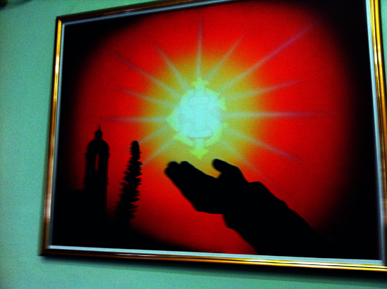 Na oportunidade, o mandatário local recebeu Pires em seu gabinete e lhe mostrou um quadro no qual homenageia o Inter. A obra mostra a torre da Igreja Matriz de São João Batista, as mãos que trabalham a terra e no centro, o símbolo do Clube iluminado por um facho de luz. “Esse quadro representa a paixão deste torcedor pelo Internacional e a sua homenagem ao Colorado mais amado do Brasil”, declarou Gelson Pires.