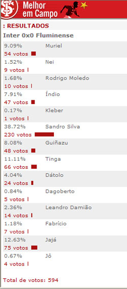 O volante Sandro Silva foi eleito o melhor jogador em campo no empate colorado em 0 a 0 contra o Fluminense, no Beira-Rio. A grande atuação do jogador lhe rendeu 38,72% dos votos na enquete realizada pelo site do Inter. Veja o resultado completo: