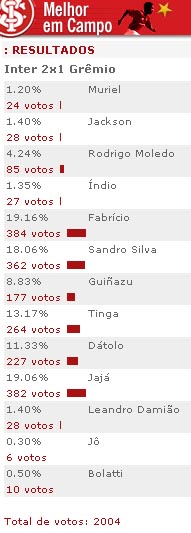 Em uma enquete marcada pelo equilíbrio, o lateral Fabrício recebeu a maioria dos votos e foi eleito o melhor jogador em campo no Gre-Nal 392. Autor do gol do título da Taça Farroupilha, o camisa 14 do Inter, que teve a missão de substituir Kleber, ganhou 384 votos (19.16%). O meia-atacante Jajá ficou com 382 votos, Sandro Silva com 362 e Tinga com 264, evidenciando que o Colorado teve na força coletiva a sua principal virtude no clássico disputado no Beira-Rio.