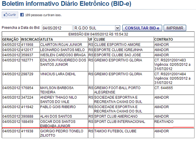 Uma excelente notícia para o Internacional: Oscar está liberado para atuar em partidas oficiais pelo time colorado. O nome do jogador foi publicado na tarde desta sexta-feira (4/5)no Boletim Informativo Diário (BID) da Confederação Brasileira de Futebol.