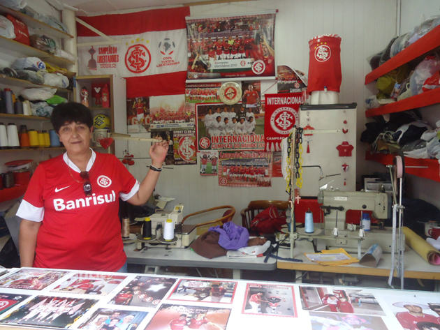 A sócia colorada Ione Terezinha decidiu levar a paixão pelo Internacional para o seu ambiente de trabalho. Ione trabalha como costureira e decorou o seu ateliê com bandeiras, adesivos, fotos e camisetas do Clube.