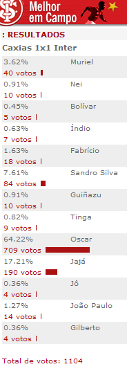 De volta ao time após 47 dias sem poder atuar, o meia Oscar foi eleito o melhor em campo no empate em 1 a 1 com o Caxias, em enquete realizada pelo site do Inter. Autor do gol colorado no Centenário, o jogador recebeu 709 votos (64.22%) dos internautas. Confira os números da votação: