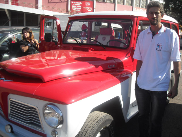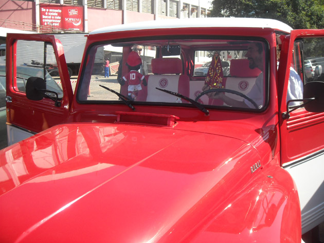 Uma caminhonete Ford Rural Willys, ano 1964, nas cores vermelha e branca, com bancos de couro e com o símbolo do Sport Club Internacional, recolherá todo e qualquer artigo com o símbolo do Inter. Vale camisetas, camisas, toalhas, abrigos e jaquetas. As doações, que devem estar em boas condições de uso, serão entregues para as 352 crianças coloradas do Centro Social Padre Pedro Leonardi, da Restinga, coordenado pelo Padre Ceron.