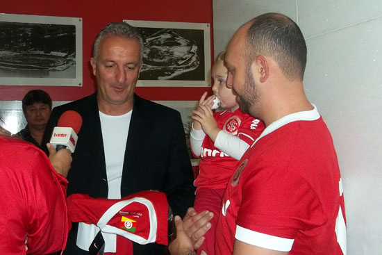 O Internacional convidou o João Francisco e os papais Amanda e Everson para visitarem o vestiário do Beira-Rio, na última sexta-feira (11/05). O técnico Dorival Jr., em nome do Clube, entregou produtos do Inter e uma camisa oficial autografada por todos os jogadores que será leiloada pela família. “Quero fazer a entrega dessa camisa, é uma lembrança com muito carinho. O garoto vale ouro, e nós vamos tentar fazer o nosso melhor em campo para poder dar uma alegria a todos vocês”, disse o técnico colorado ao fazer a doação.