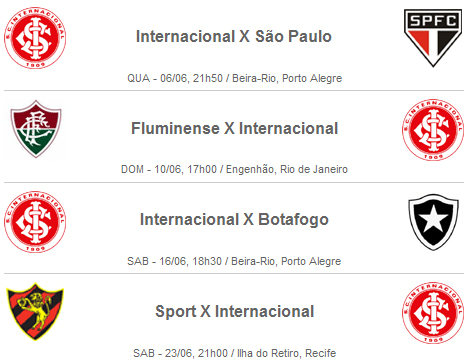 O Internacional terá nove dias de intervalo até a próxima partida do Campeonato Brasileiro, marcada para o dia 6 de junho, às 21h50, diante do São Paulo, no Beira-Rio. Até lá, o técnico Dorival Júnior aproveitará para intensificar a preparação para a sequência de quatro partidas do mês de junho. A pausa no Brasileirão se dá em função da 'Data Fifa' (entre dias 1 e 5 de junho), que é utilizada para a realização de amistosos internacionais de seleções.