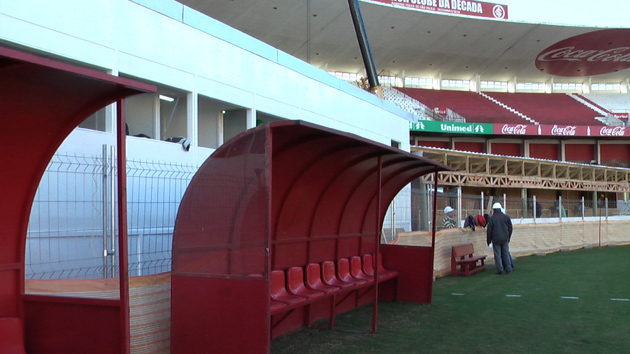 Já o prédio provisório para as cabines de imprensa, erguido na beira do gramado, no local onde antes ficava o reservado do time visitante, será inaugurado nesta quarta-feira (06/06), no jogo do Internacional x São Paulo. As antigas cabines de imprensa estão em fase final de demolição.