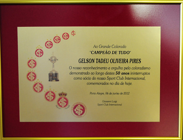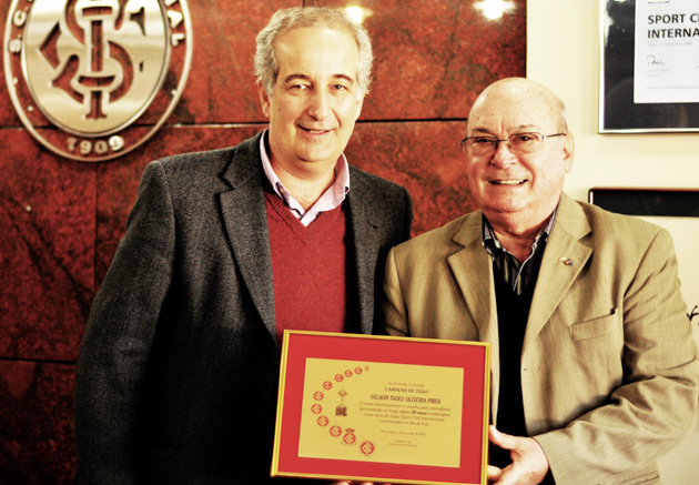 O vice-presidente de relações sociais do Internacional Gelson Pires completou 50 anos como sócio do Clube nesta quarta-feira, dia 6 de junho. Para homenagear este meio século de associação, o Sport Club Internacional, por meio do presidente Giovanni Luigi, concedeu uma placa em homenagem ao dirigente colorado.