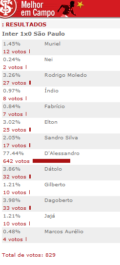 O meia D'Alessandro foi eleito o melhor jogador em campo na vitória diante do São Paulo nesta quarta-feira (06/06), pela terceira rodada do Brasileirão. O craque argentino foi o autor de um golaço de falta que deu a segunda vitória do Inter na competição. Veja abaixo o resultado da enquete promovida pelo site do Inter: