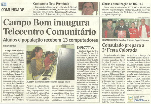 A Festa Colorada que o consulado de Novo Hamburgo está preparando foi destaque nos jornais NH e Canudos, da região. Os veículos divulgaram a venda de ingressos para o evento que acontece dia 13 de julho e o tralho que vem sendo realizado pelos colorados da unidade do Inter no Vale do Sinos.