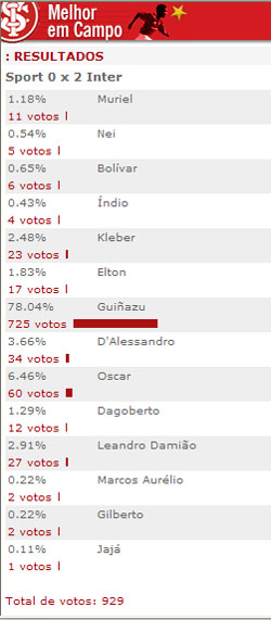 O volante Guiñazu defendeu e atacou com qualidade, inclusive fazendo o passe para o gol de Damião, na vitória contra o Sport, em Recife, em partida válida pela sexta rodada do Brasileirão. A grande atuação rendeu ao ídolo da torcida o status de melhor jogador em campo com quase 80% dos votos, em enquete promovida pelo site colorado. Confira os números da votação: