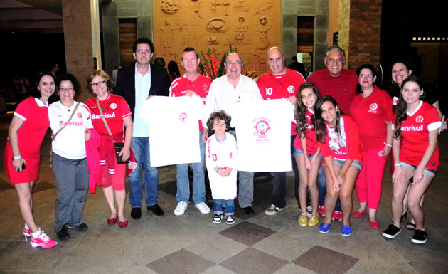 O artigo, que tem a mensagem 'Vamo, vamo, Inter - Bahia x Inter' e a data do confronto estampadas, foi entregue ao vice-presidente de relações sociais, Gelson Pires, ao vice de futebol, Luciano Davi, e ao assessor de futebol Cuca Lima.