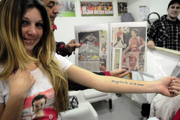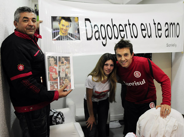 Natural do Ceará, ela acompanha o jogador há anos de longe, mas só teve a oportunidade de conhecê-lo agora, em Porto Alegre, onde está trabalhando no cuidado a uma senhora. A mudança para a capital gaúcha, aliás, se deu em razão do amor por Dagoberto, que está tatuado em seu braço esquerdo.