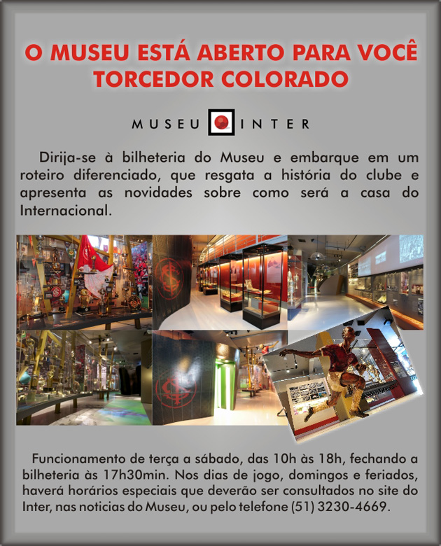 Aproveite o sábado para visitar o Museu do Inter antes do jogo contra o Cruzeiro, pelo Brasileirão. O horário de funcionamento será das 10h às 18h. A bilheteria funciona até as 17h30.