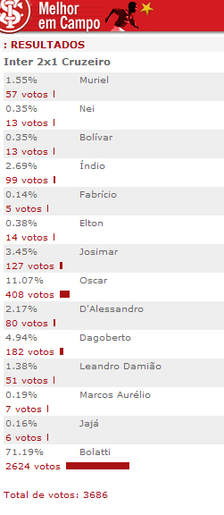 O volante Bolatti foi eleito o melhor jogador em campo na partida contra o Cruzeiro, no sábado (07/07). O jogador foi eleito com 71,19% dos votos em enquete realizada pelo site do Inter. Veja o resultado completo: